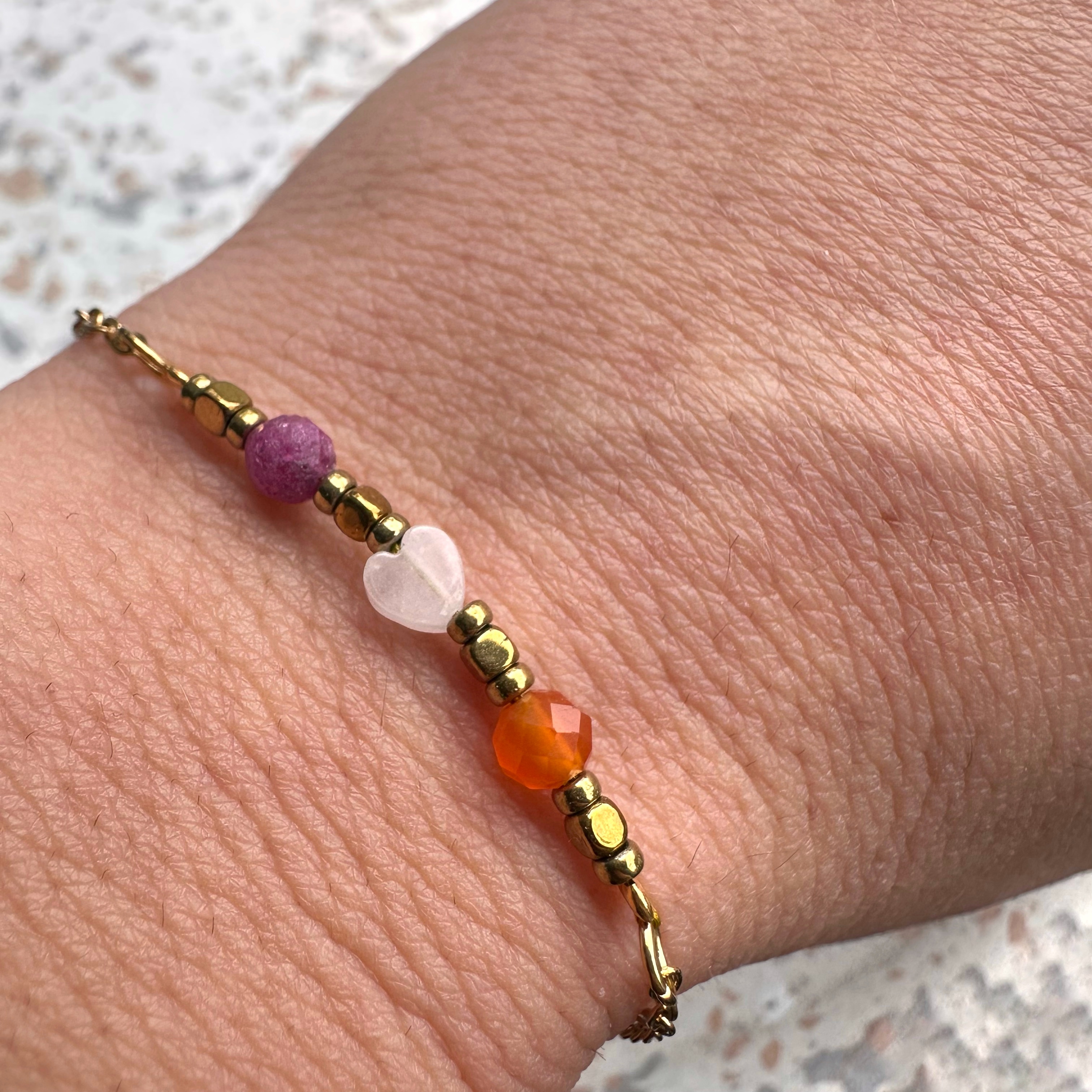 Połączenie karneolurubinu i kwarcu różowego w kształcie serca tworzy mocną, kobiecą i magnetyczną energię — pełną pasji, przyciągania, pewności siebie i otwartego serca.