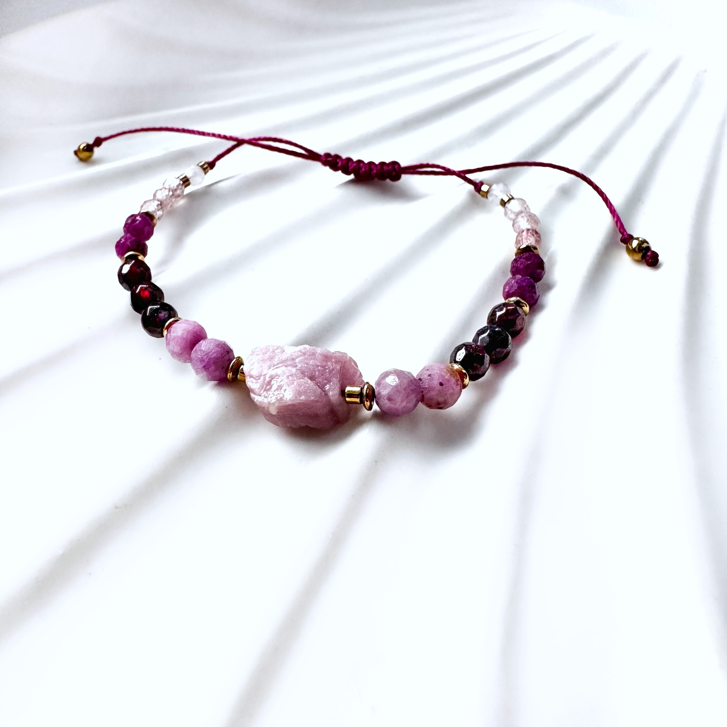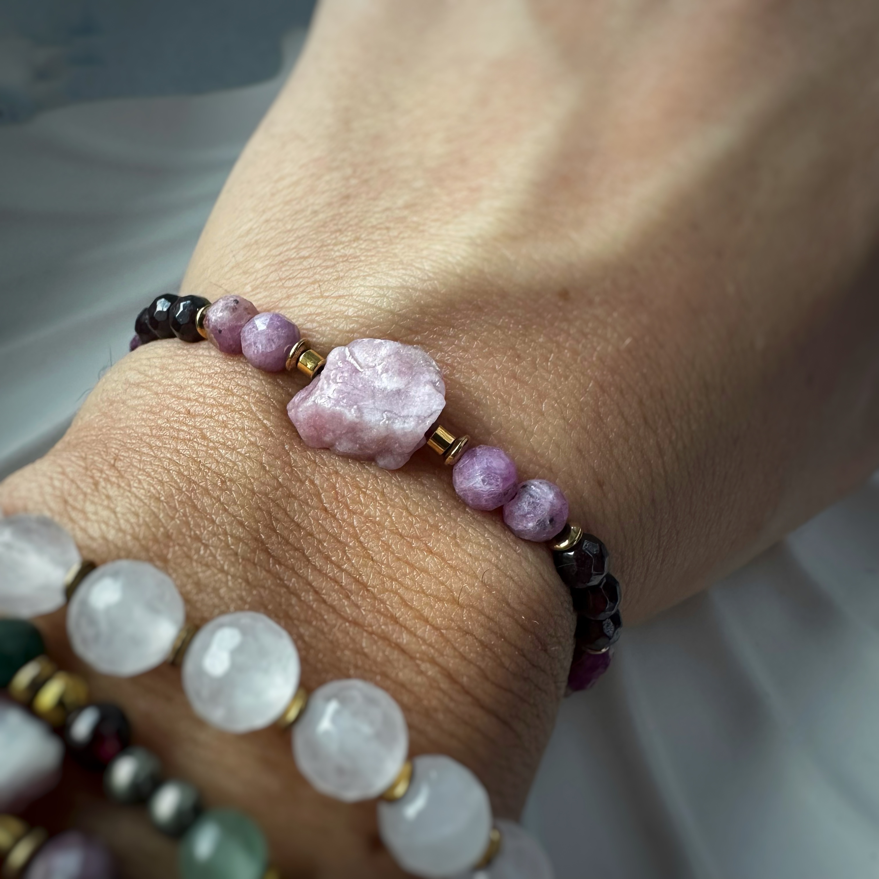 Bransoletka „Kod Miłości Bogini” została stworzona z połączenia kamieni o najwyższych wibracjach serca i kobiecości: rubelitu, rubinów, różowego kwarcu, granatu i kwarcu truskawkowego. To mistyczny talizman otwierający na miłość – namiętną, duchową i pełną wdzięku. Jej energia łączy z wewnętrzną boginią – tą częścią Ciebie, która kocha głęboko, przyciąga z lekkością i promieniuje magnetyzmem.