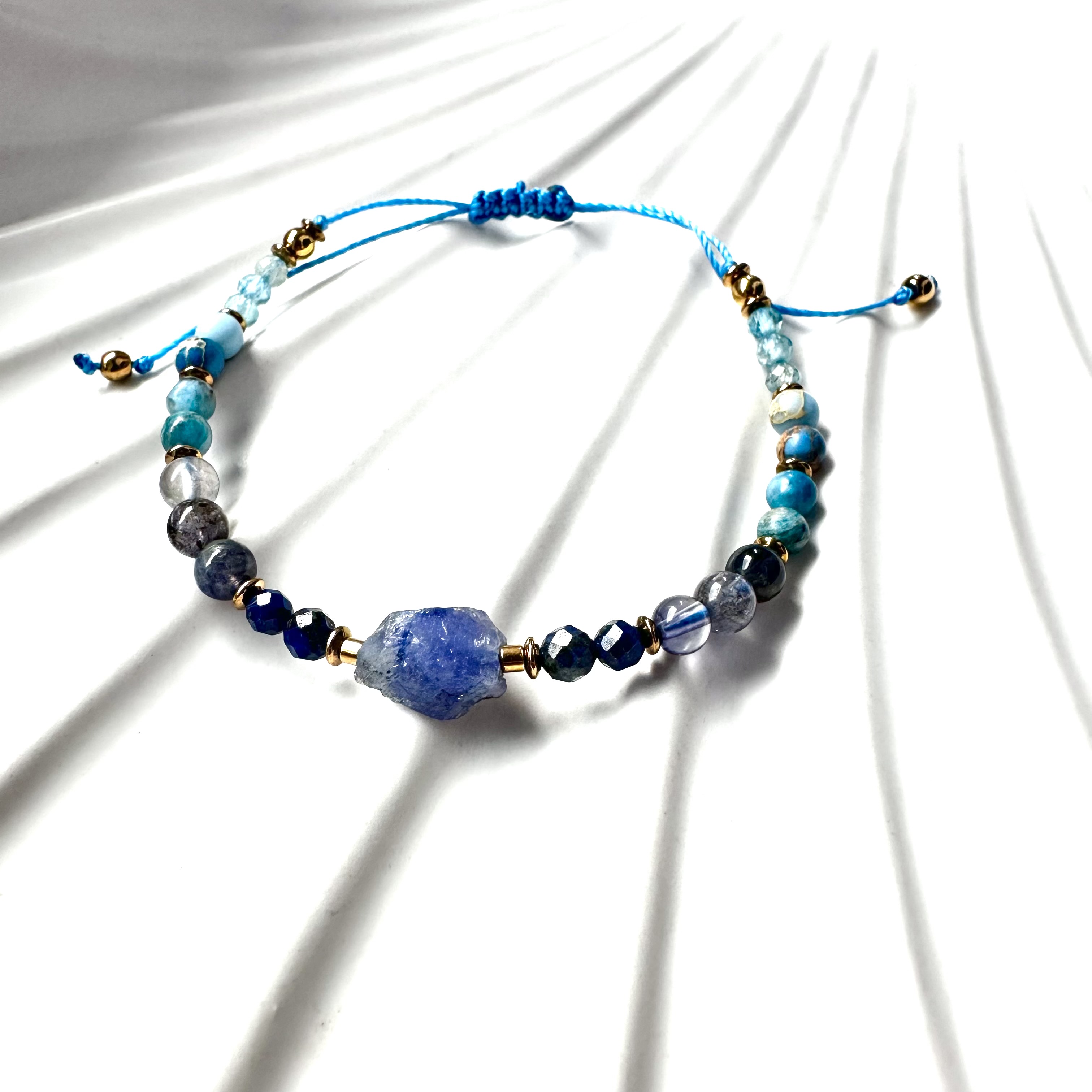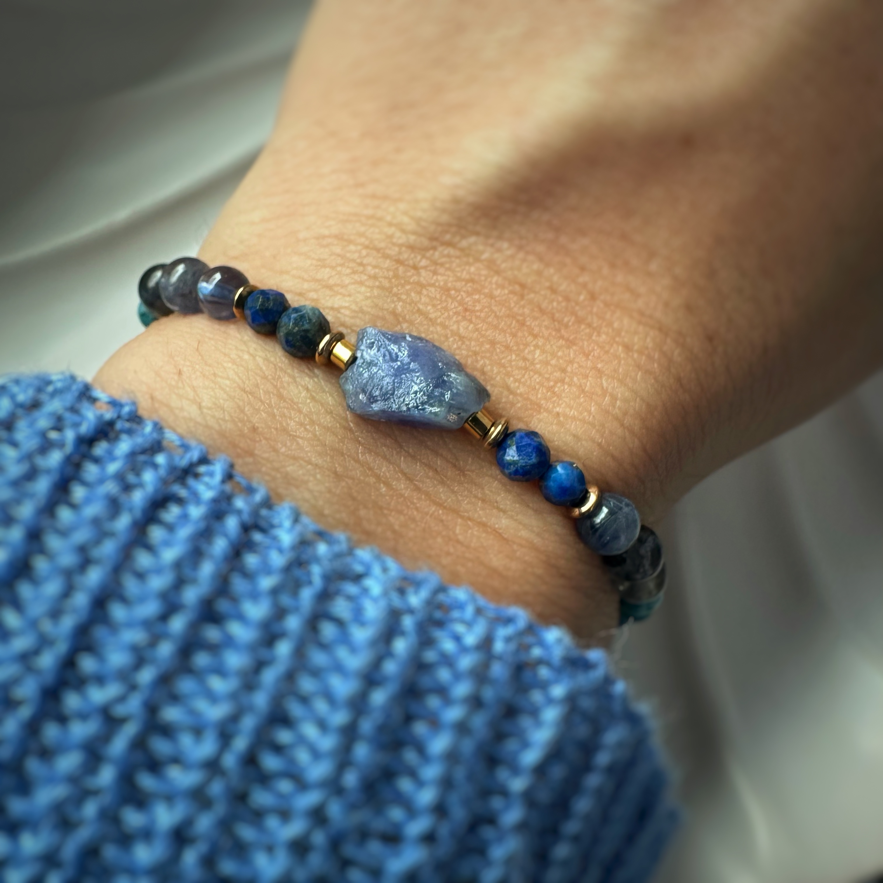 Bransoletka „Kod Wysokiej Wibracji” została stworzona z połączenia kamieni o silnym działaniu duchowym i mentalnym: tanzanitu, lapisu lazuli, iolitu, apatytu i jaspisu cesarskiego. To energetyczny amulet dla osób, które rozwijają intuicję, poszerzają świadomość i pragną działać z poziomu wyższej energii – klarownie, odważnie i w harmonii ze swoją duszą.