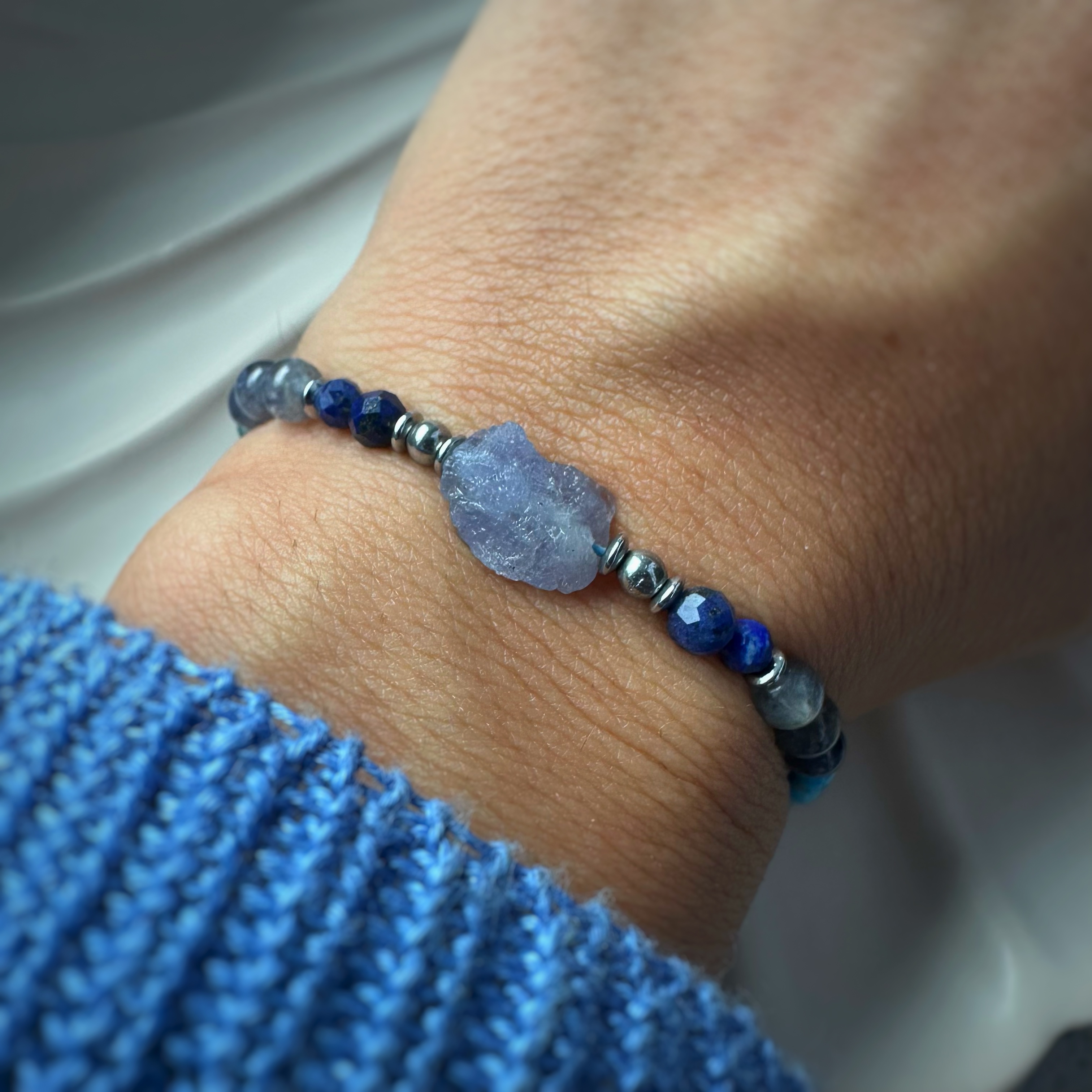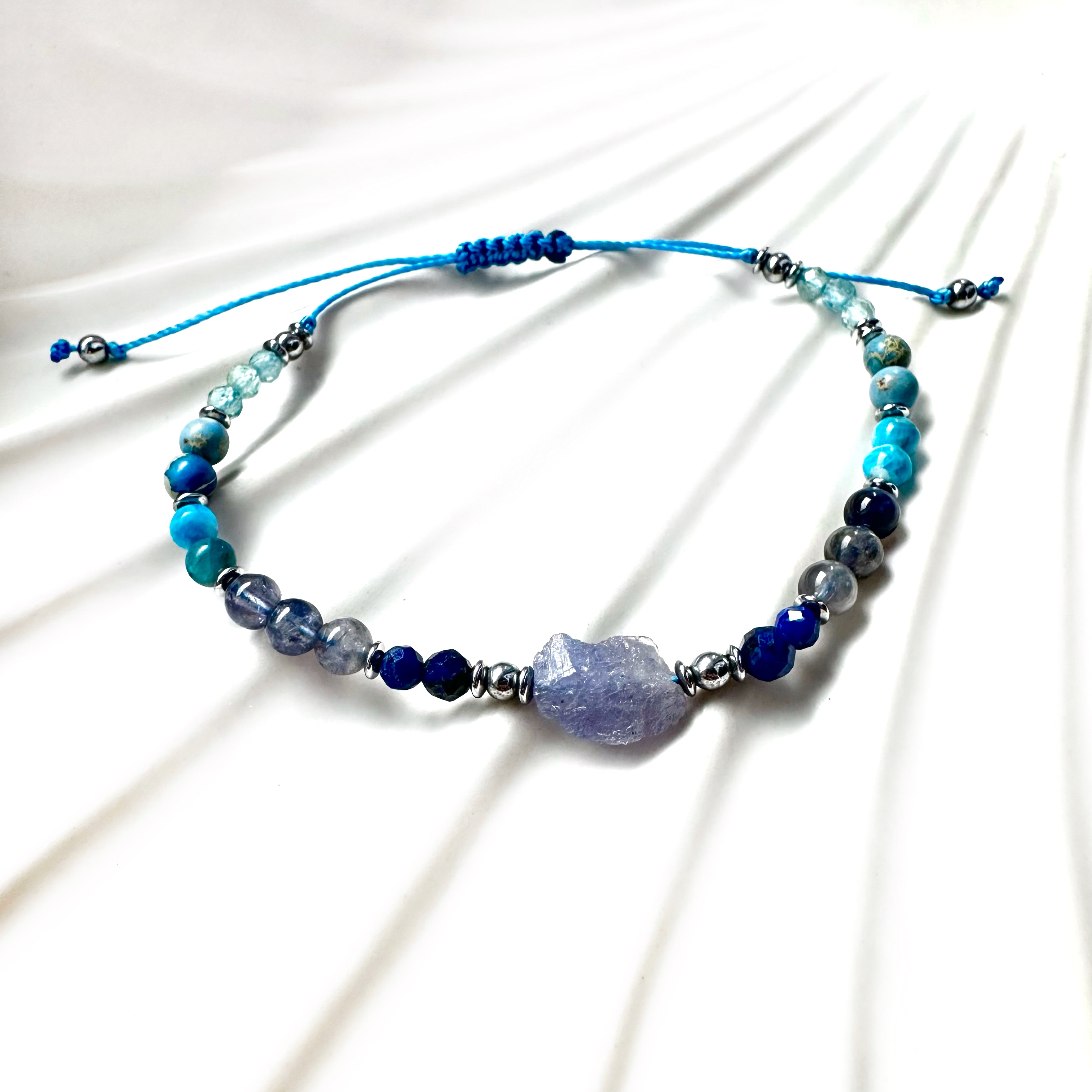 Bransoletka „Kod Wysokiej Wibracji” została stworzona z połączenia kamieni o silnym działaniu duchowym i mentalnym: tanzanitu, lapisu lazuli, iolitu, apatytu i jaspisu cesarskiego. To energetyczny amulet dla osób, które rozwijają intuicję, poszerzają świadomość i pragną działać z poziomu wyższej energii – klarownie, odważnie i w harmonii ze swoją duszą.