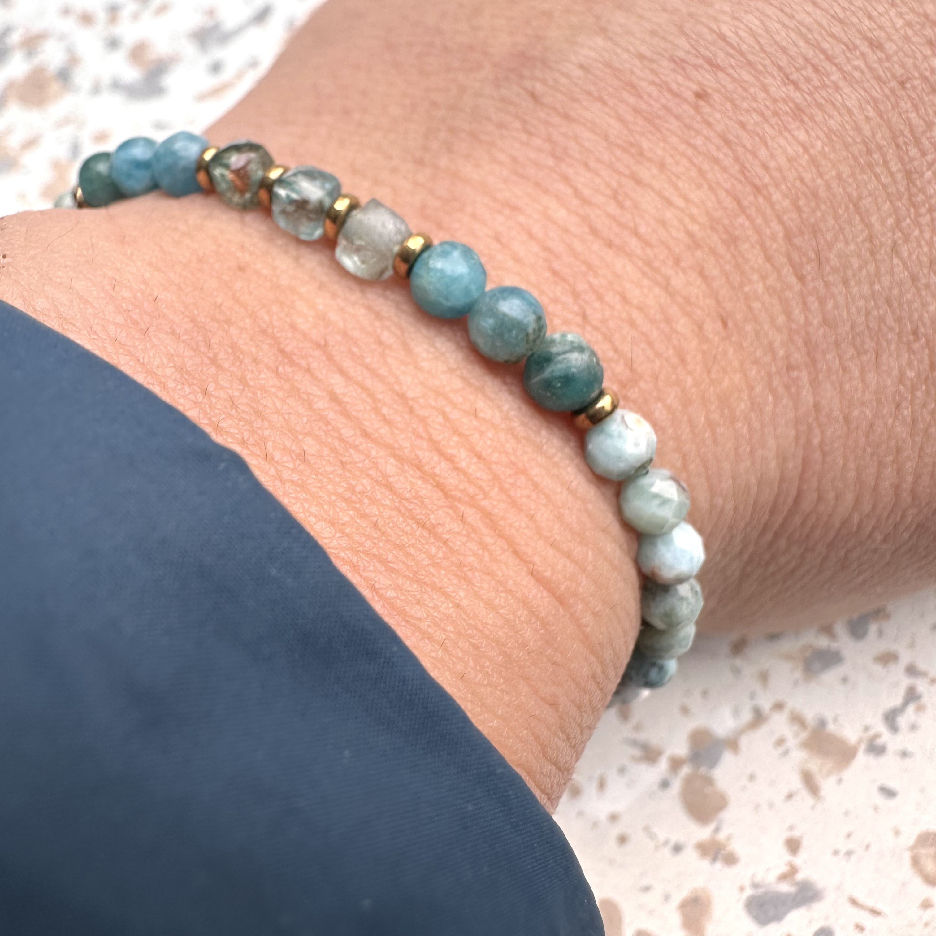 Apatyt – kamień ekspresji, inspiracji i odwagi do mówienia swojej prawdy. Pomaga uwolnić blokady komunikacyjne, wzmacnia pewność siebie i wspiera realizację wewnętrznych pragnień.
