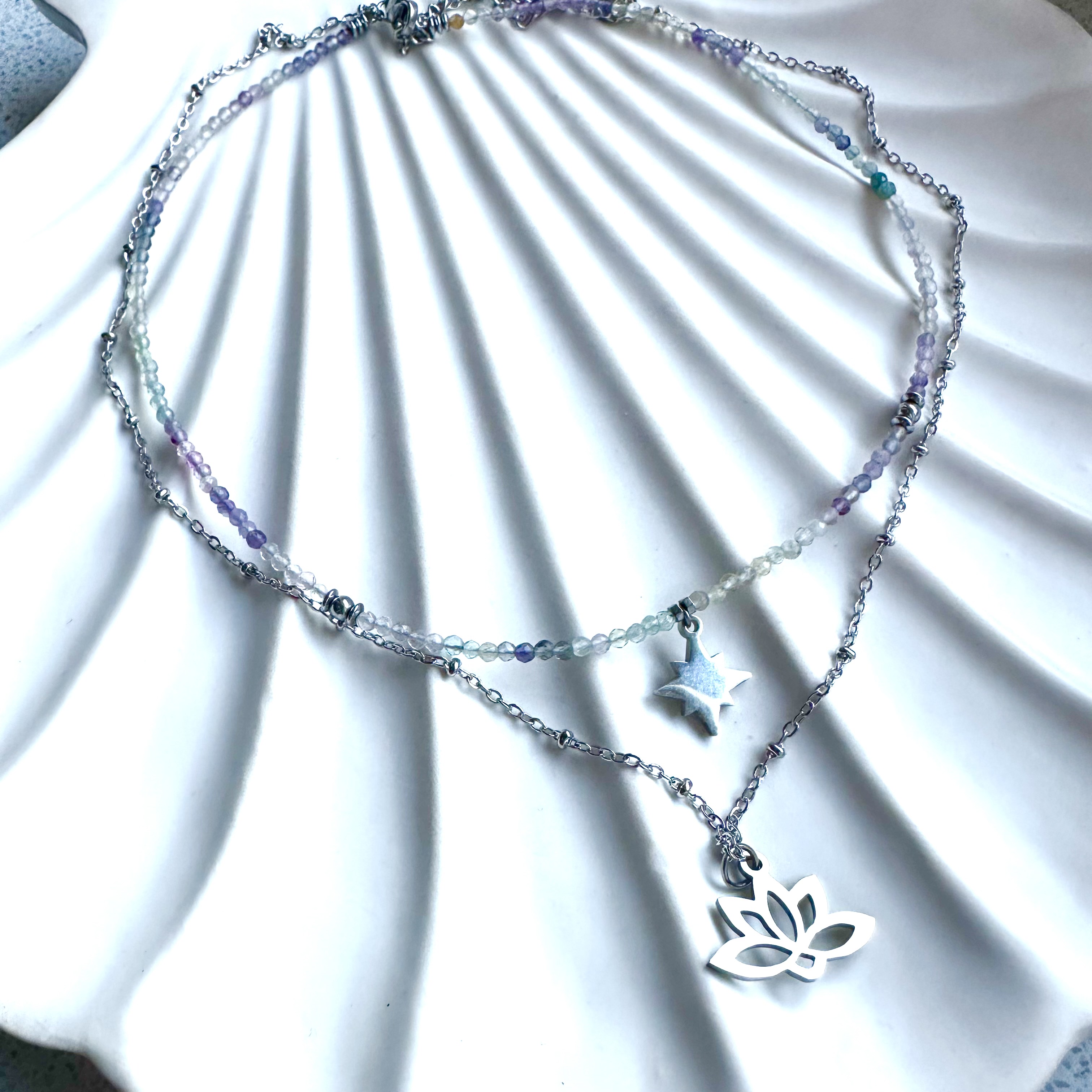 Eteryczna wersja naszyjnika „Energia Bogini” w odcieniach srebra i pastelowego fluorytu. Kamień ten był używany w starożytnym Egipcie do tworzenia amuletów ochronnych i świątynnych dekoracji, symbolizując światło świadomości i oczyszczenie duszy.