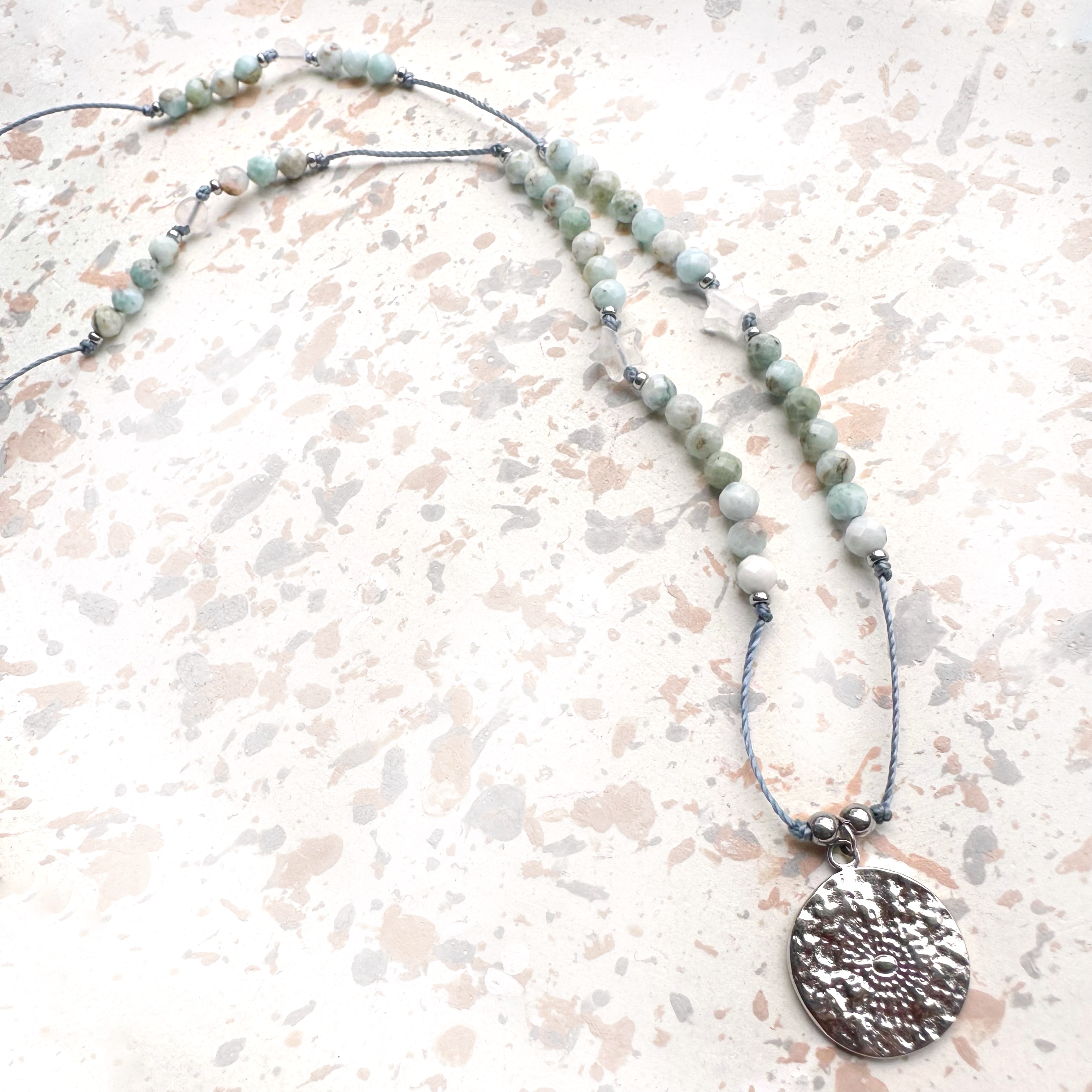 Centralną rolę odgrywa larimar — kamień oceanu, delfinów i starożytnej Atlantydy. Jego spokojna, błękitna energia niesie w sobie wibrację spokoju, prawdy i połączenia dusz, pomagając odnaleźć swoją wewnętrzną harmonię i przyciągnąć relacje na poziomie serca i duszy.