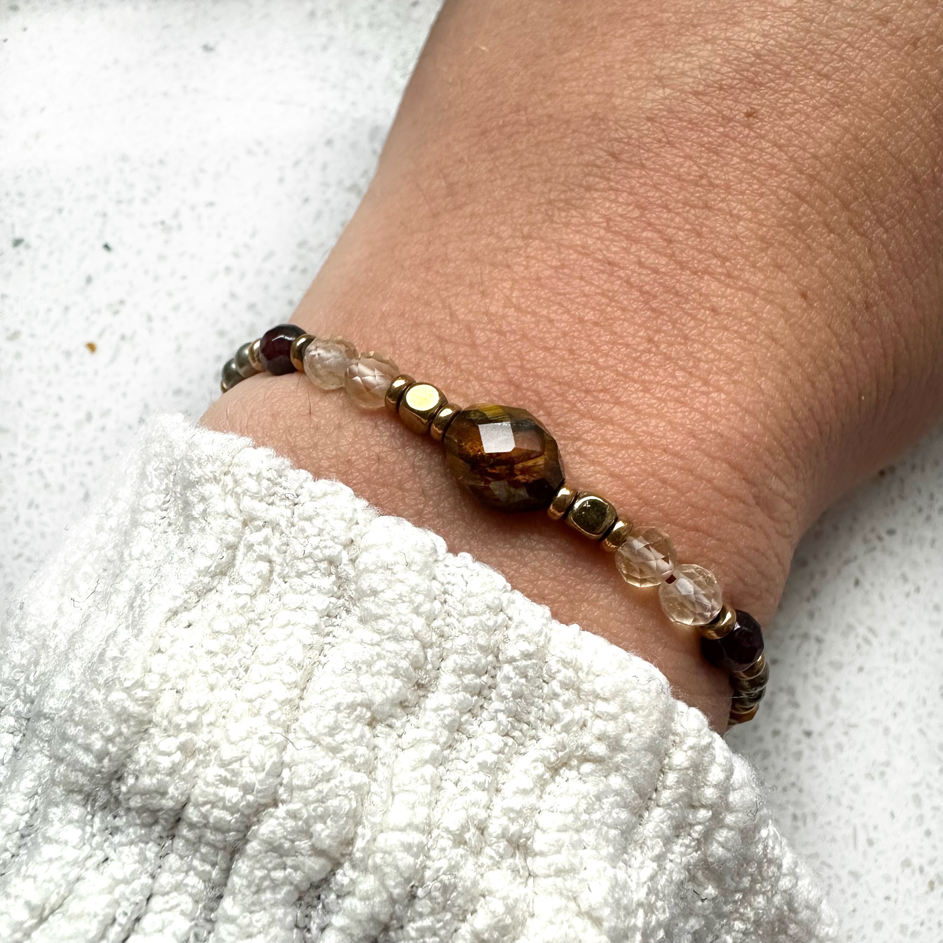 Bransoletka „Kod Obfitości” została stworzona dla osób, które pragną otworzyć się na swobodny przepływ pieniędzy, sukces zawodowy oraz stabilność finansową, jednocześnie wzmacniając swoją odwagę i sprawczość. Połączenie tygrysiego oka, cytrynu, pirytu oraz granatu tworzy silne pole energetyczne wspierające dobrobyt, ochronę i świadome działanie.