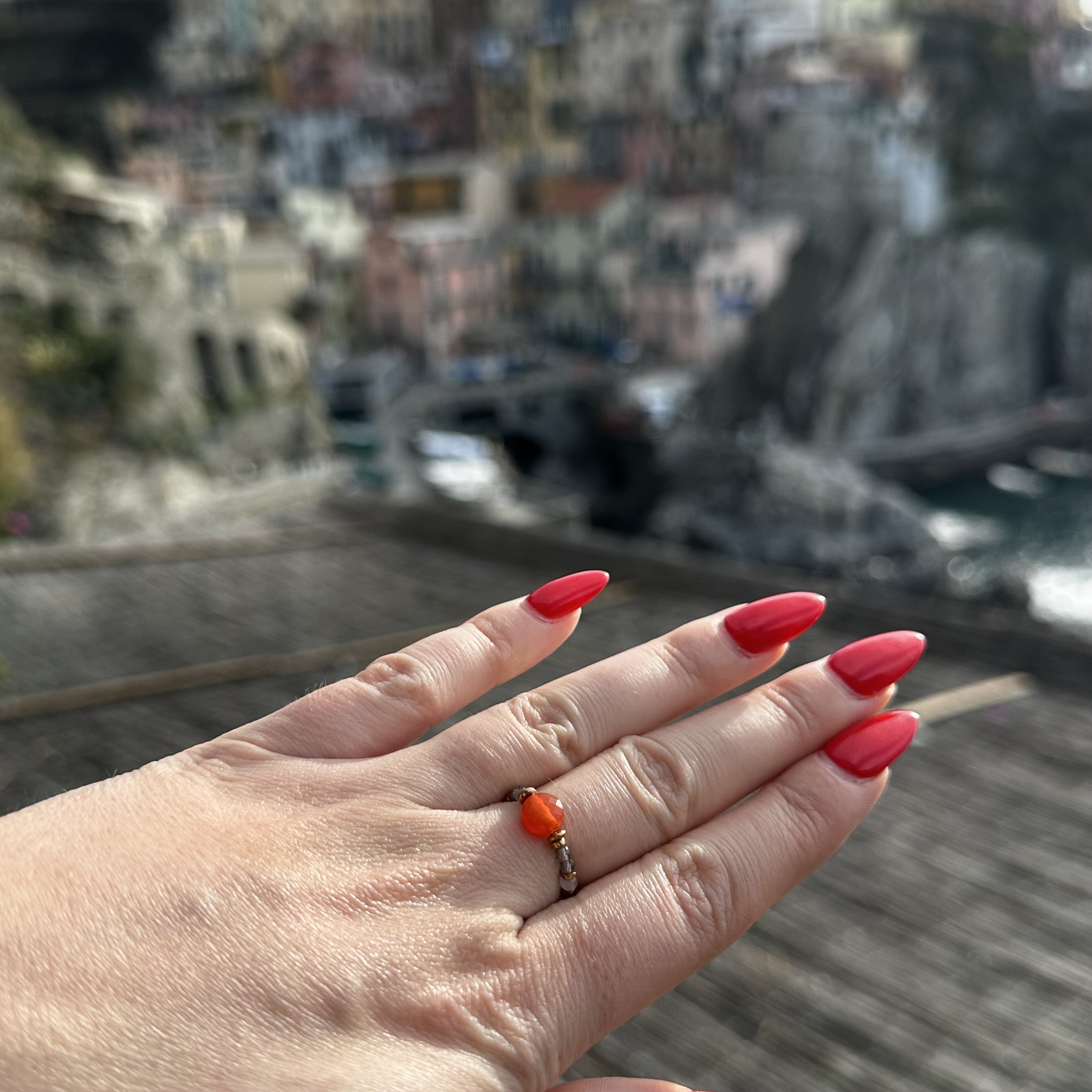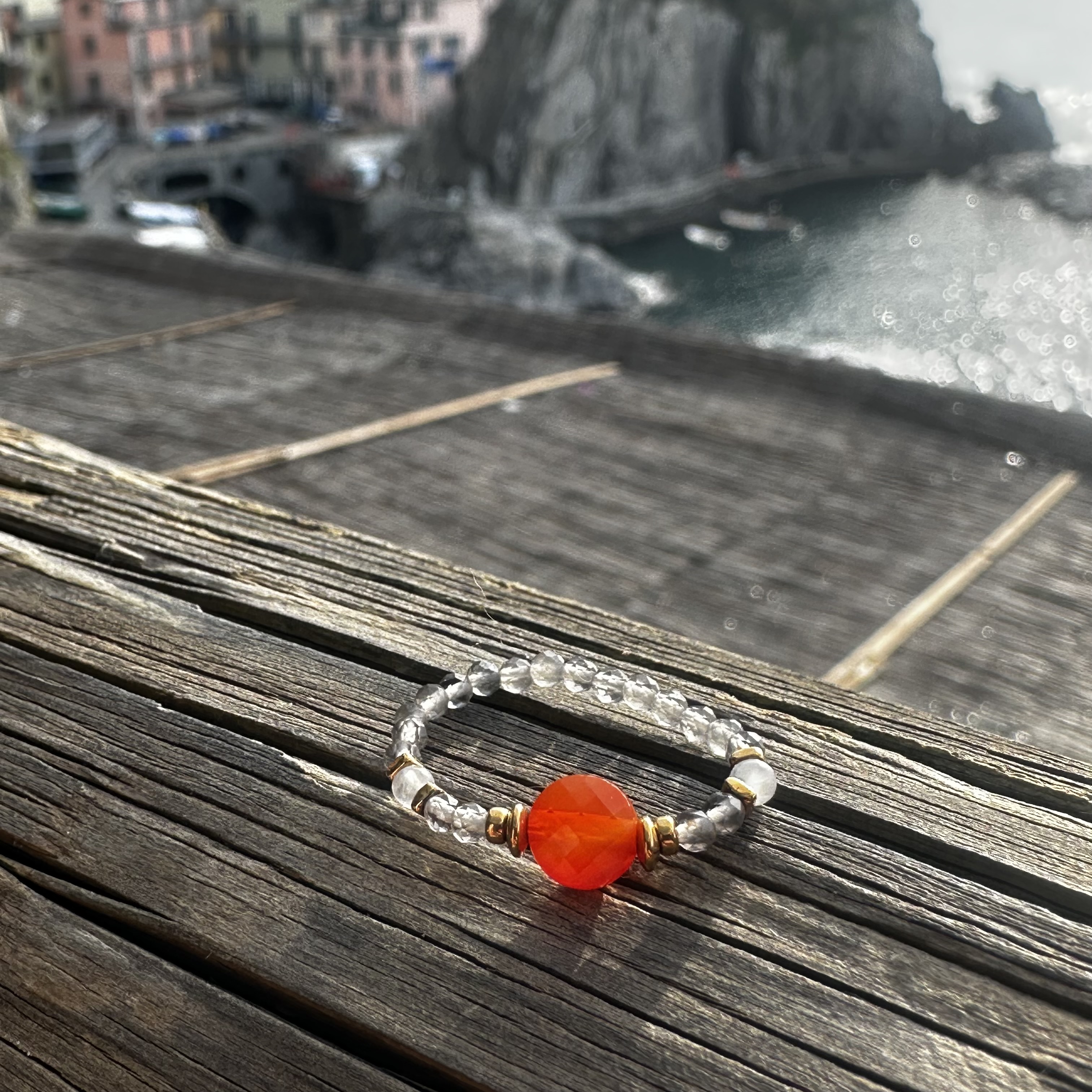 Pierścień „Kraina Świtu – Pierścień Mocy i Odrodzenia” to połączenie ognistego karneolu, harmonizującego agatu szarego oraz subtelnego kwarcu różowego.