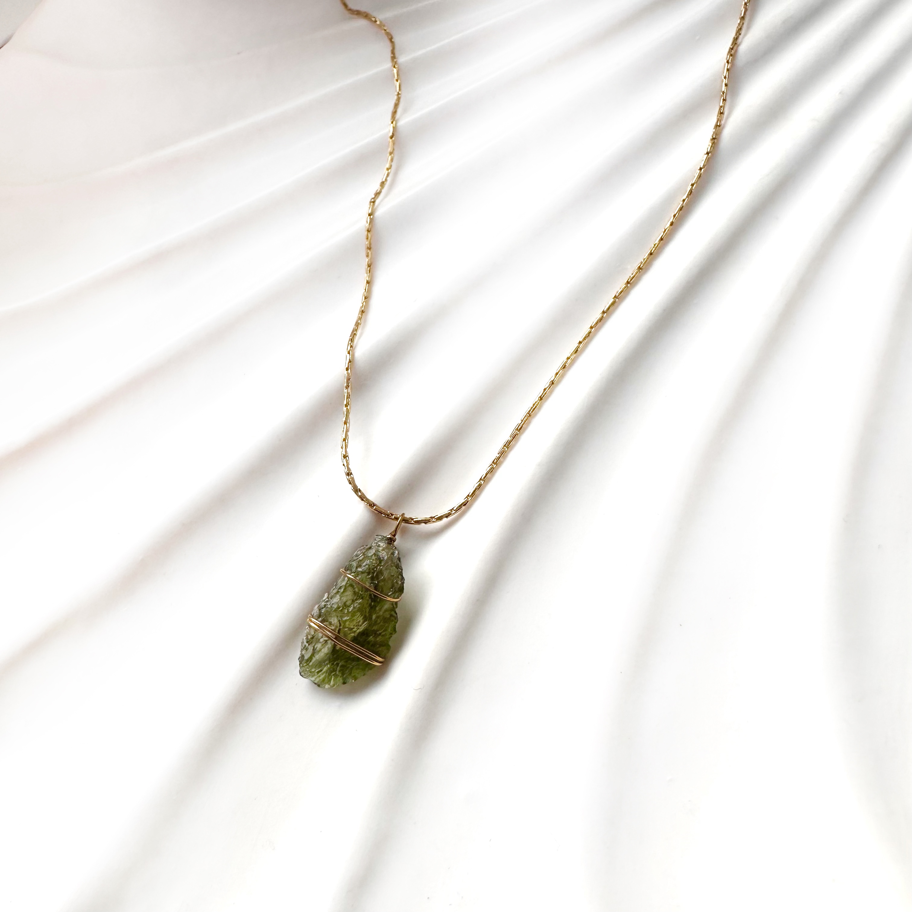 Naszyjnik „Transformacja Duszy” – surowy mołdawit w złotej oprawie