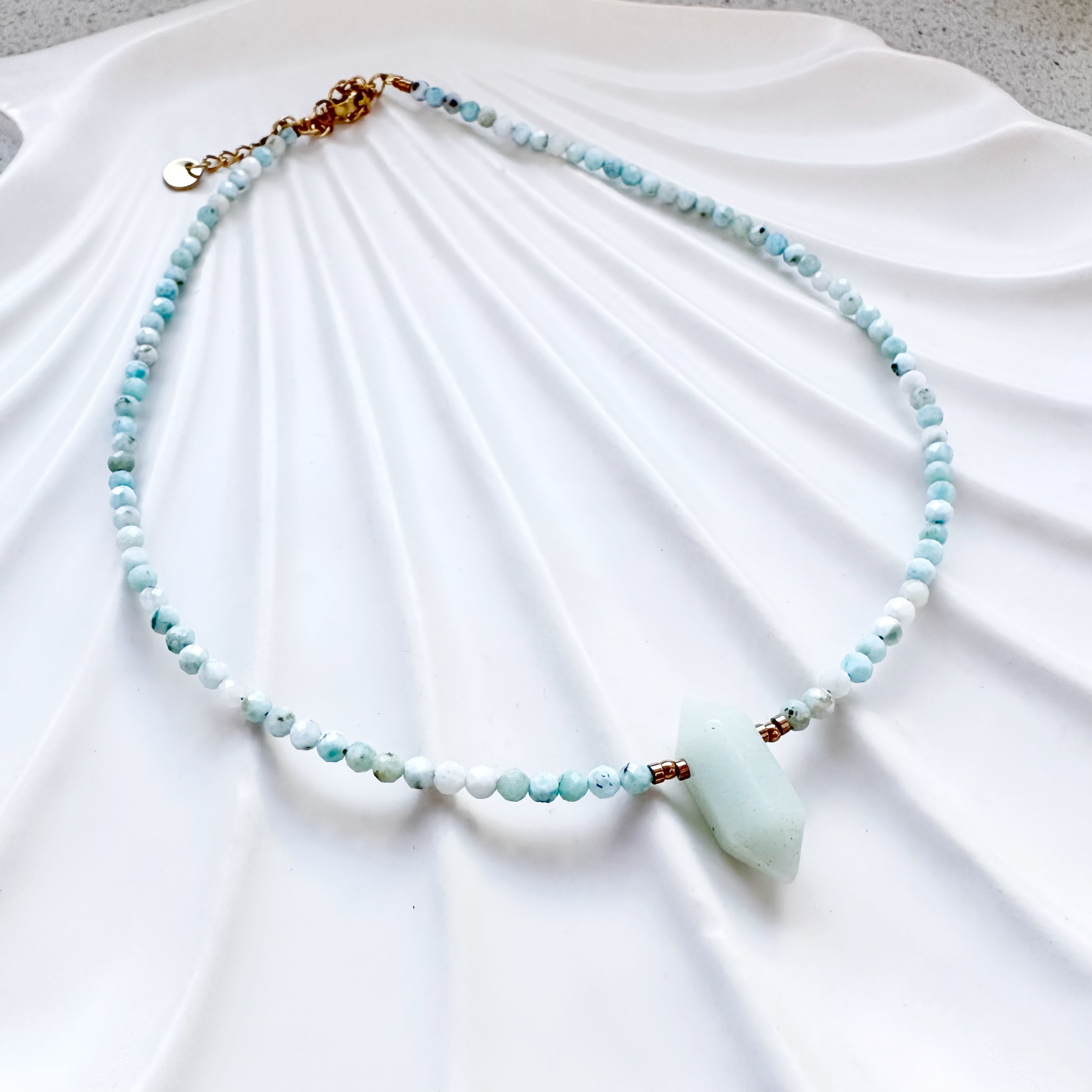 Naszyjnik stworzony z połączenia amazonitu i larimaru to wyjątkowy talizman harmonii i głębokich więzi. Amazonit, nazywany kamieniem spokoju i prawdy, pomaga wsłuchać się w głos serca i żyć w zgodzie ze sobą. Larimar, znany jako kamień bratniej duszy, wspiera odnalezienie relacji pełnych zrozumienia i duchowej bliskości.