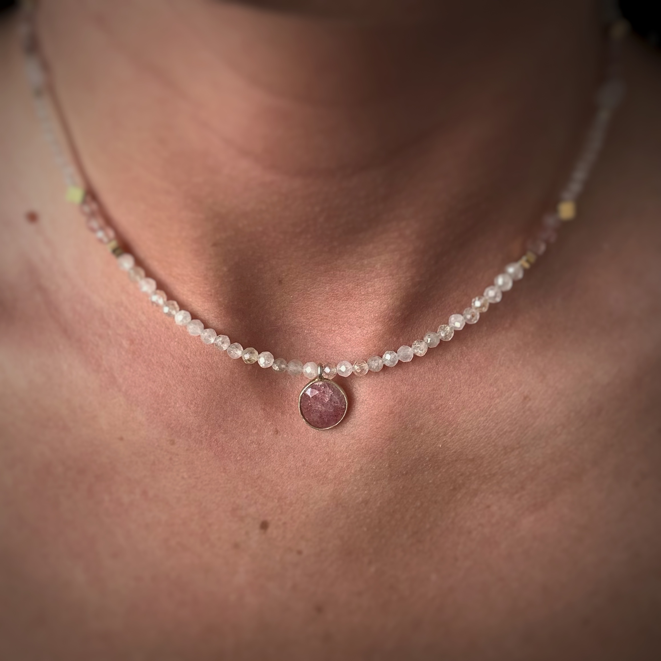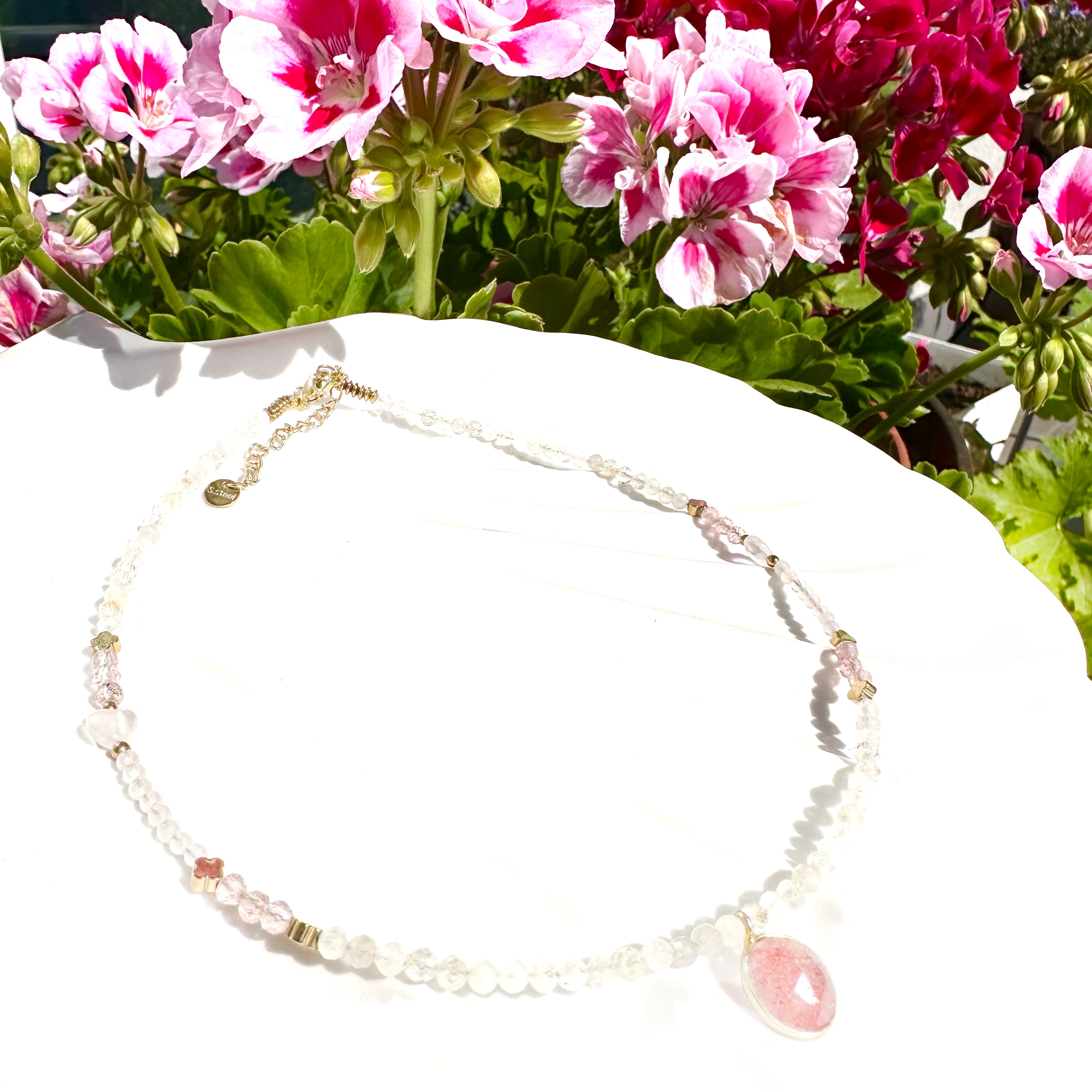 „Kobieca Subtelność” to delikatny naszyjnik stworzony z białych topazów, kwarcu truskawkowego i kwarcu różowego – kamieni, które wspierają kobiecą energię, delikatność i moc serca.