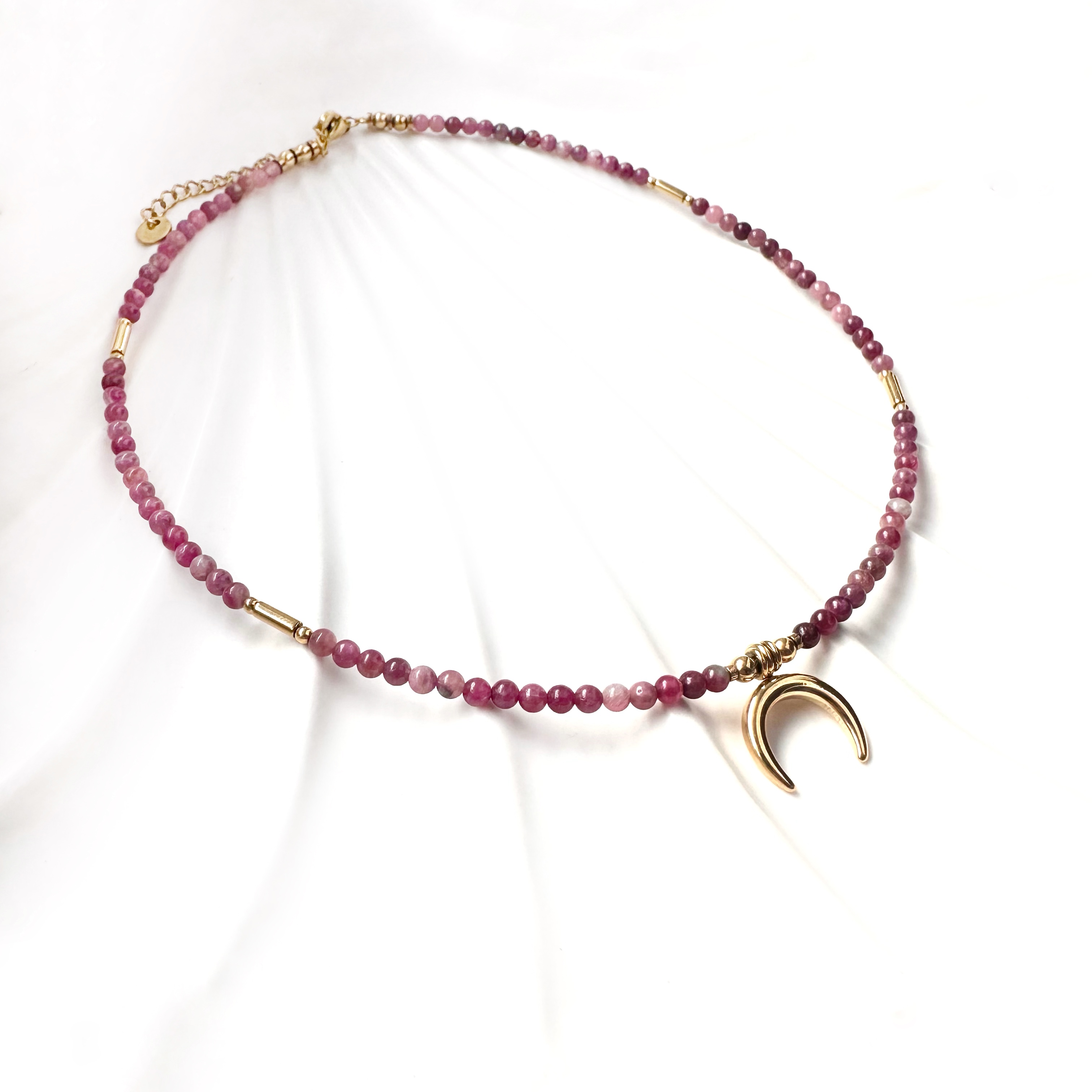 Naszyjnik „Kod Namiętności” z czerwonymi turmalinami i złotą lunulą to talizman kobiecej energii, miłości i pewności siebie. Czerwony turmalin, znany także jako rubelit, łączy w sobie wibracje serca i pasji – otwiera na miłość, wzmacnia odwagę emocjonalną i pomaga wyrażać uczucia z autentycznością.