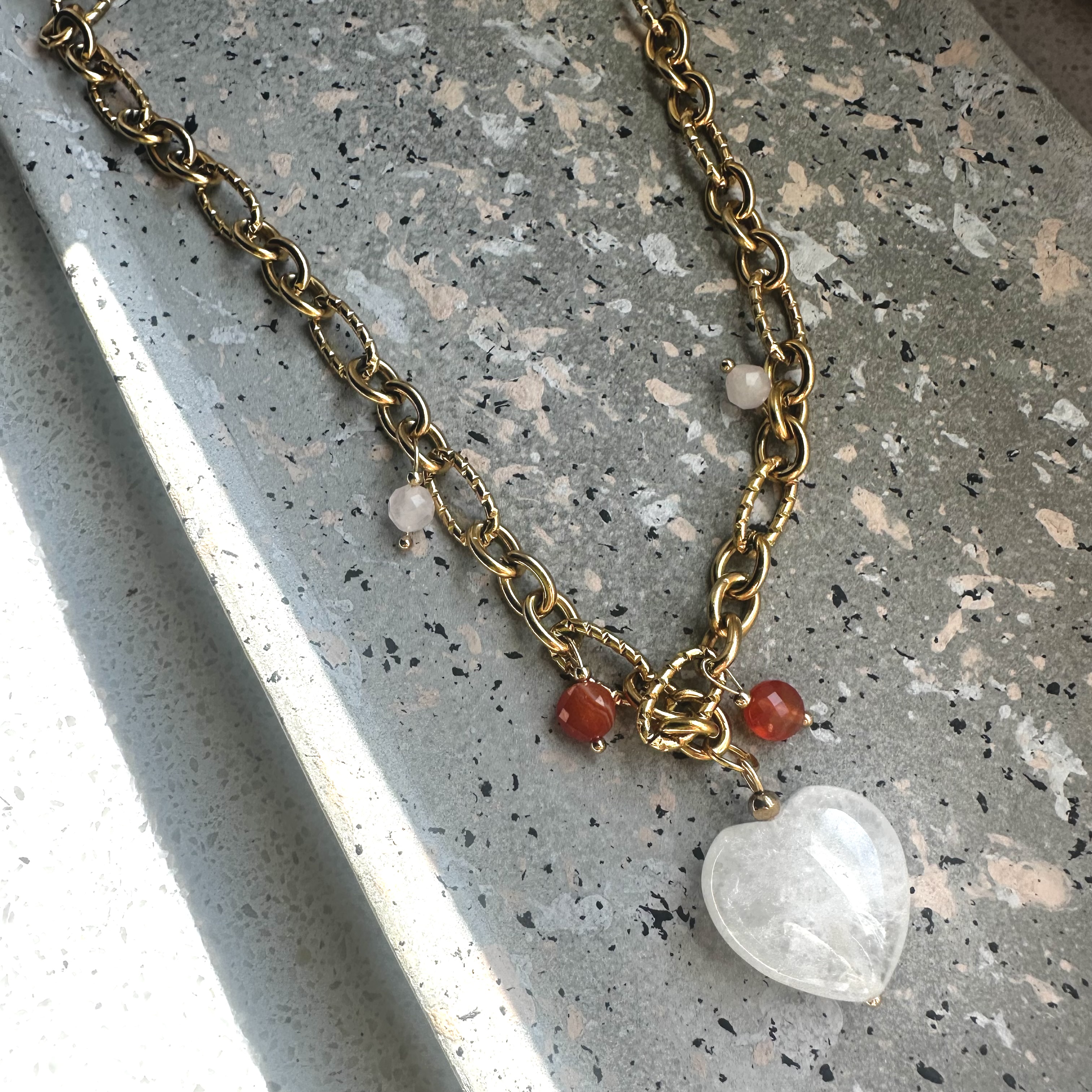 Ten naszyjnik powstał z połączenia kamieni, które niosą bardzo piękną i kobiecą energię. W centrum znajduje się serce z kamienia księżycowego – minerału intuicji, delikatności i wewnętrznej harmonii. Pomaga słuchać siebie, wzmacnia wrażliwość i przypomina, że w każdej z nas jest niezwykła, spokojna siła.