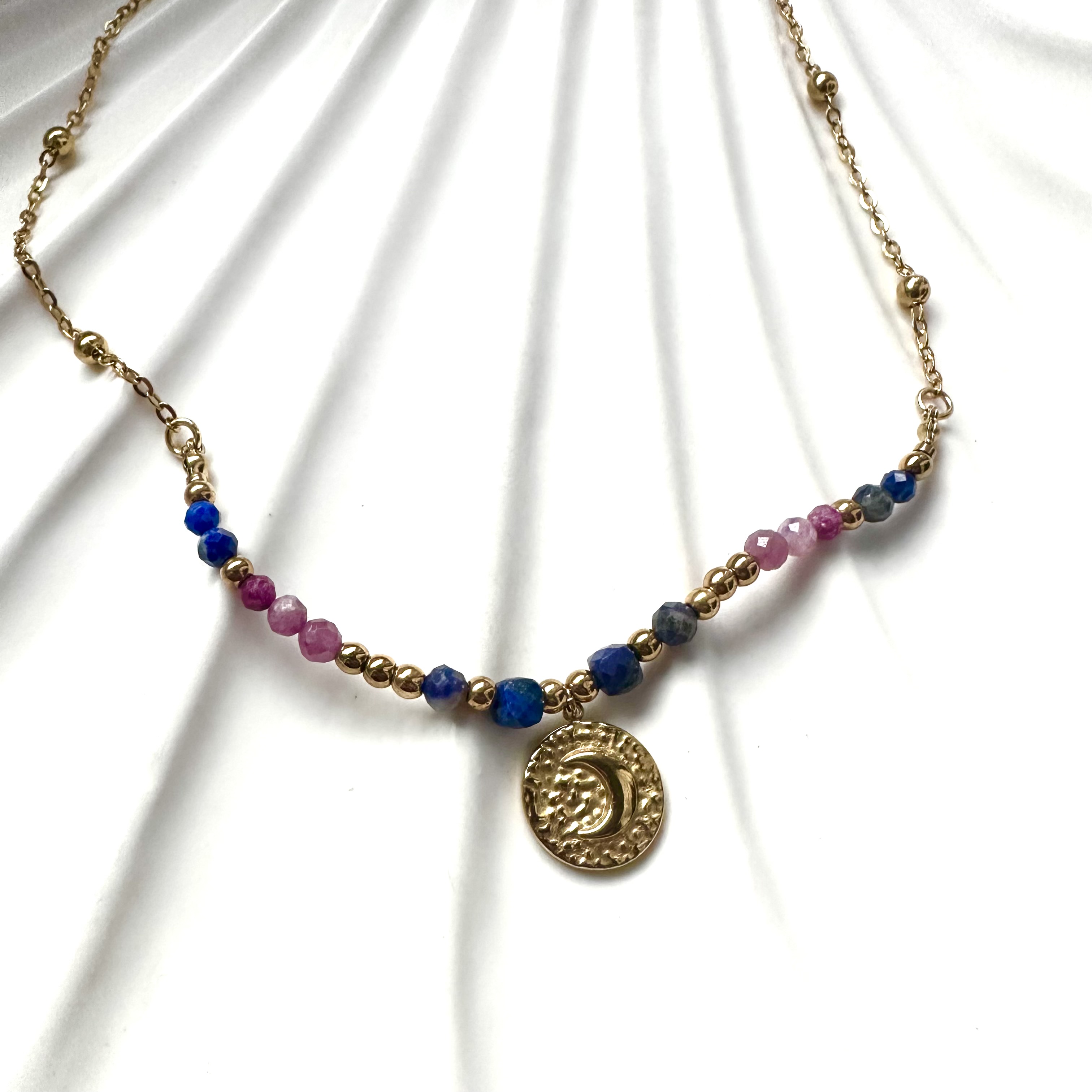 Naszyjnik inspirowany energią Księżyca – symbolem kobiecości, intuicji i emocjonalnej głębi. Stworzony z kamieni, które łączą moc serca i prawdy. Pomaga mówić z miłością, słuchać z empatią i budować relacje oparte na szczerości oraz zrozumieniu.