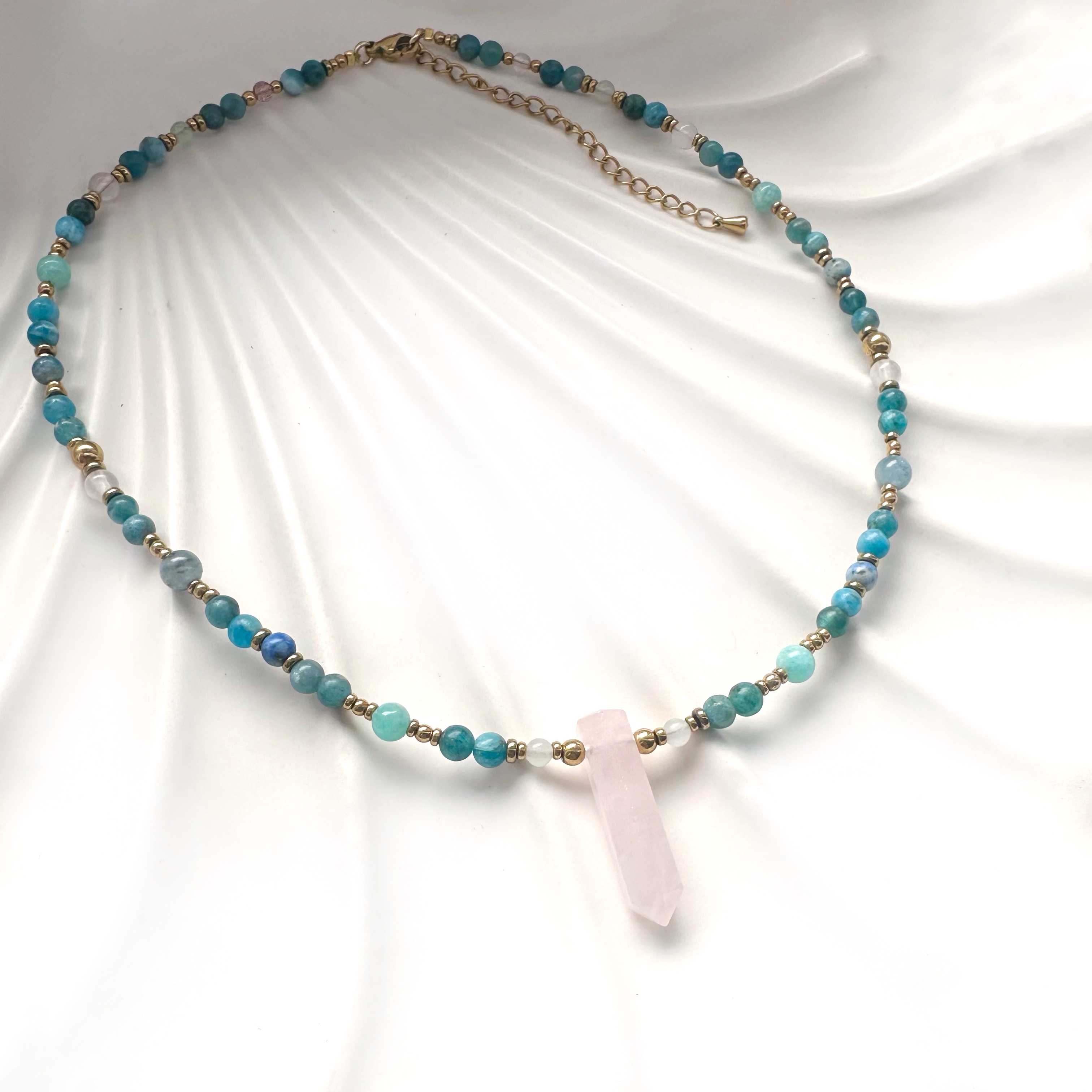 Całość dopełniają złocone hematyty, które działają ochronnie, uziemiają energię i jednocześnie dodają naszyjnikowi eleganckiego, złotego blasku.