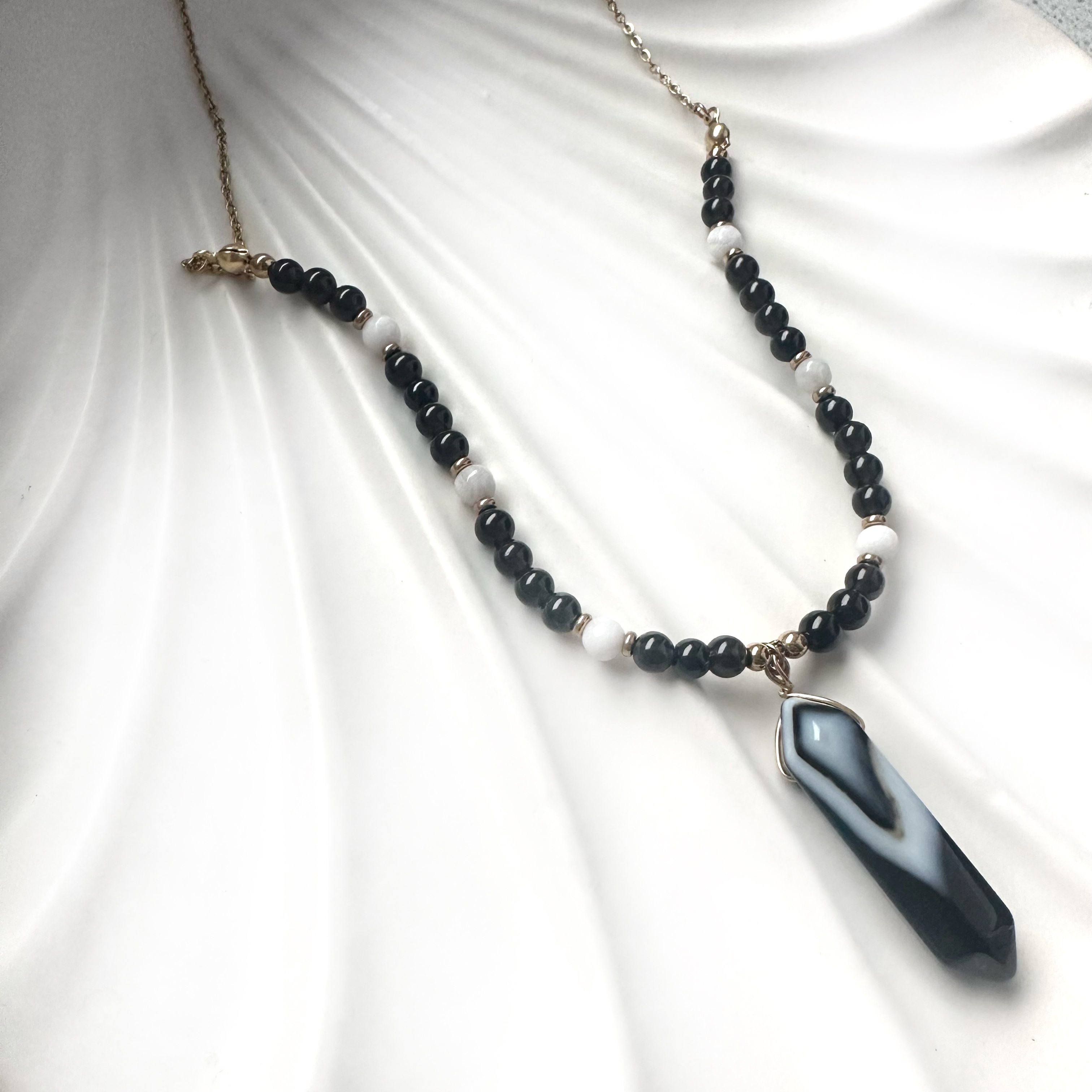 Ten naszyjnik mocy to połączenie ochrony, równowagi i wewnętrznej harmonii. Stworzony z naturalnych agatów czarnych i białych, symbolizuje balans pomiędzy światłem a cieniem, siłą a spokojem, materią a duchowością.