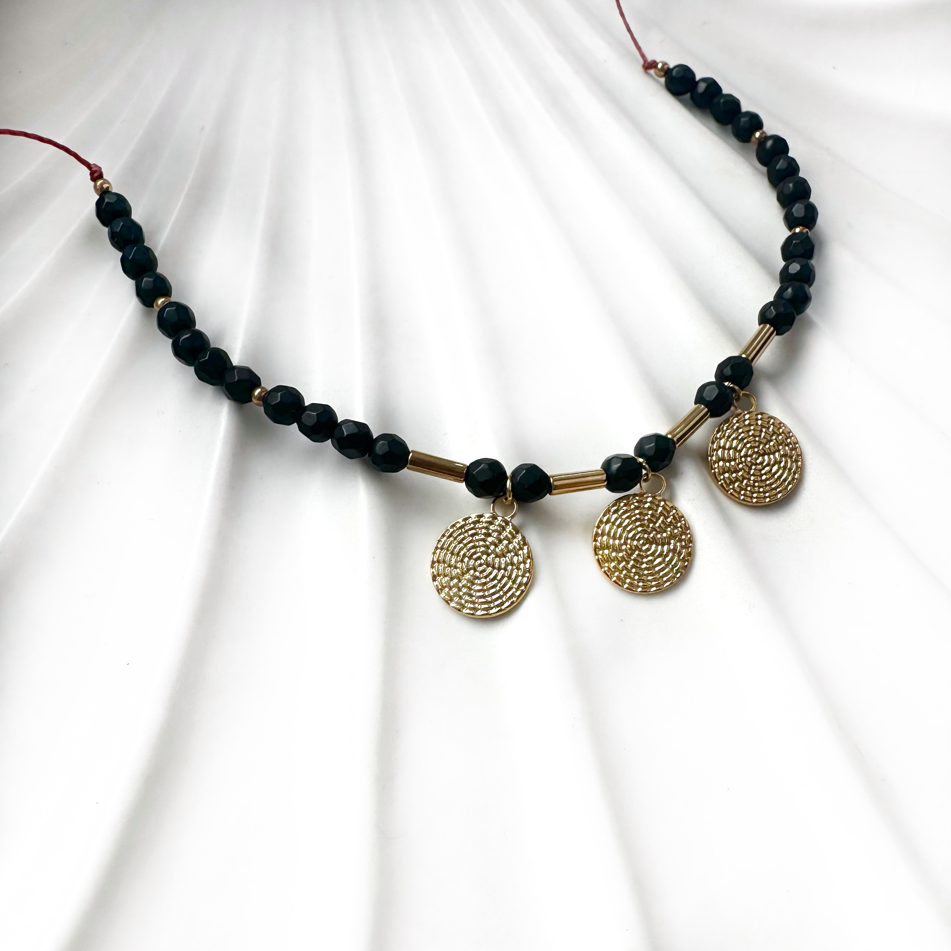 Ten wyrazisty naszyjnik to biżuteria intencyjna stworzona z myślą o sile wewnętrznej, ochronie energetycznej i stabilności. Surowa elegancja czarnego onyksu połączona ze złotymi detalami tworzy talizman, który wzmacnia, ugruntowuje i chroni.