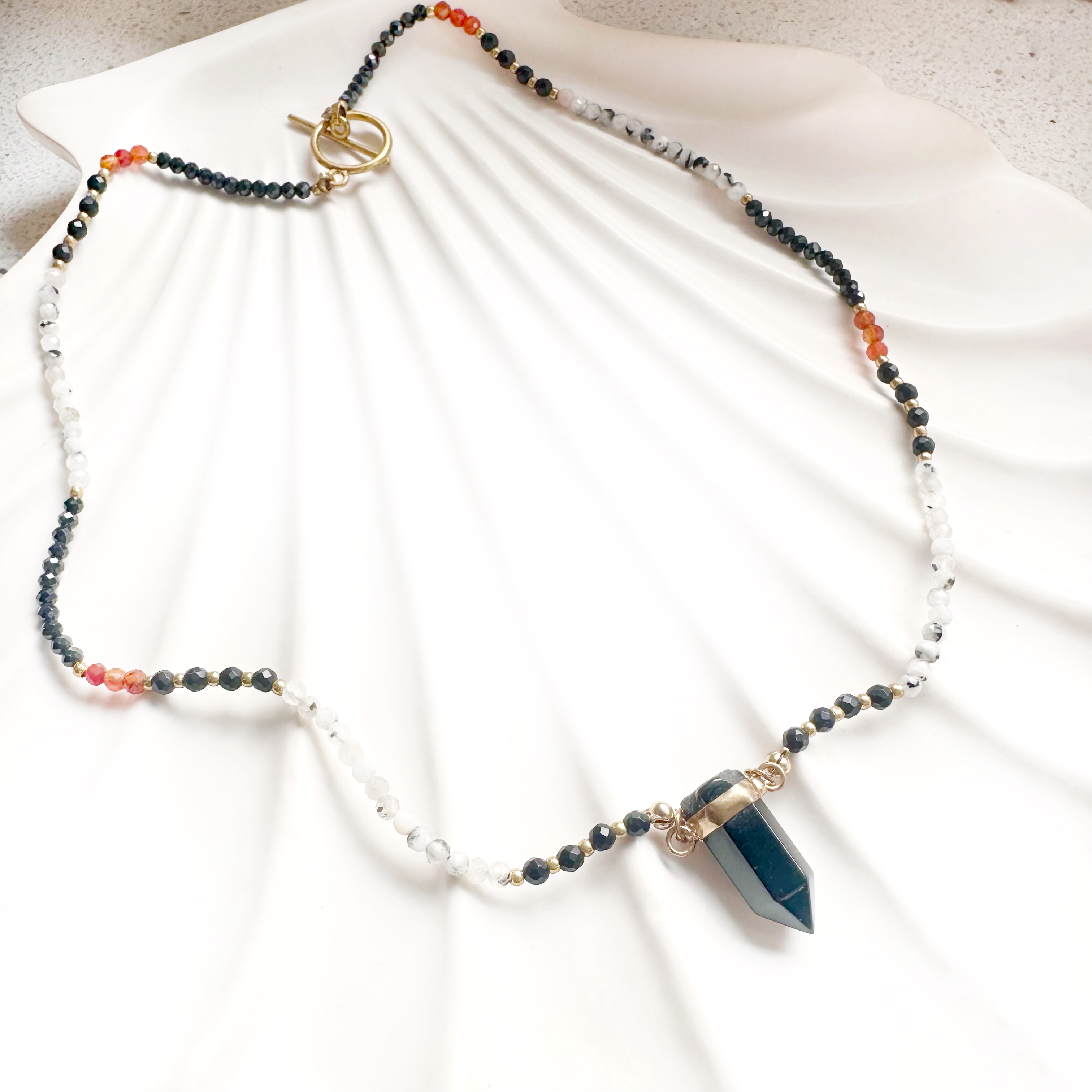 ochrona i stabilizacja (onyks) + ogień i odwaga (karneol) + intuicja i miłość (kamień księżycowy).