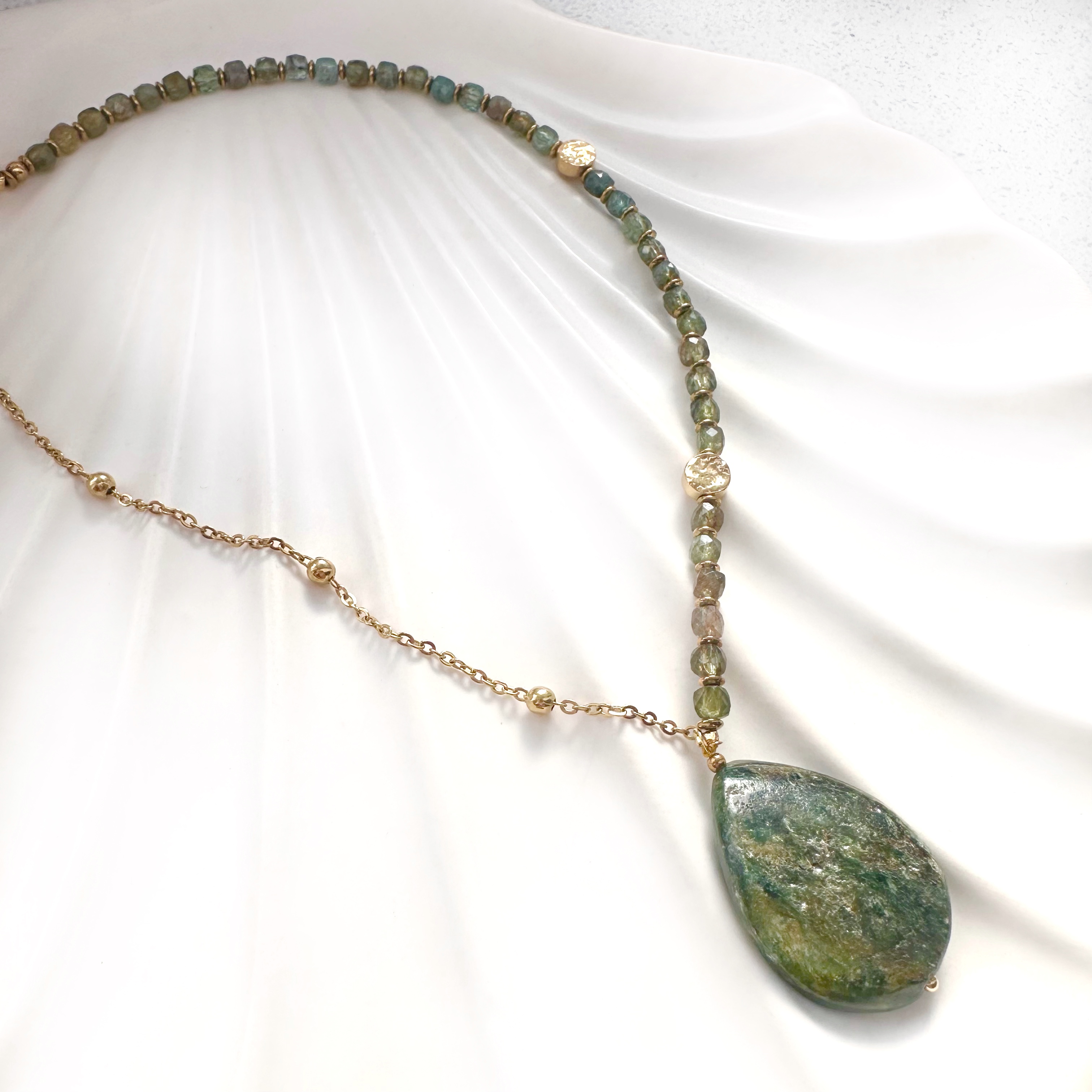 Centralnym elementem jest duży, kroplowy zielony kyanit o naturalnej, niejednolitej strukturze – przypominający fragment ziemi, lasu i żywej energii natury. Towarzyszą mu drobne, fasetowane kamienie szmaragdu, których głęboka zieleń symbolizuje miłość, wzrost i odrodzenie. Całość dopełniają złote detale i subtelny łańcuszek, nadając kompozycji elegancji i lekkości.