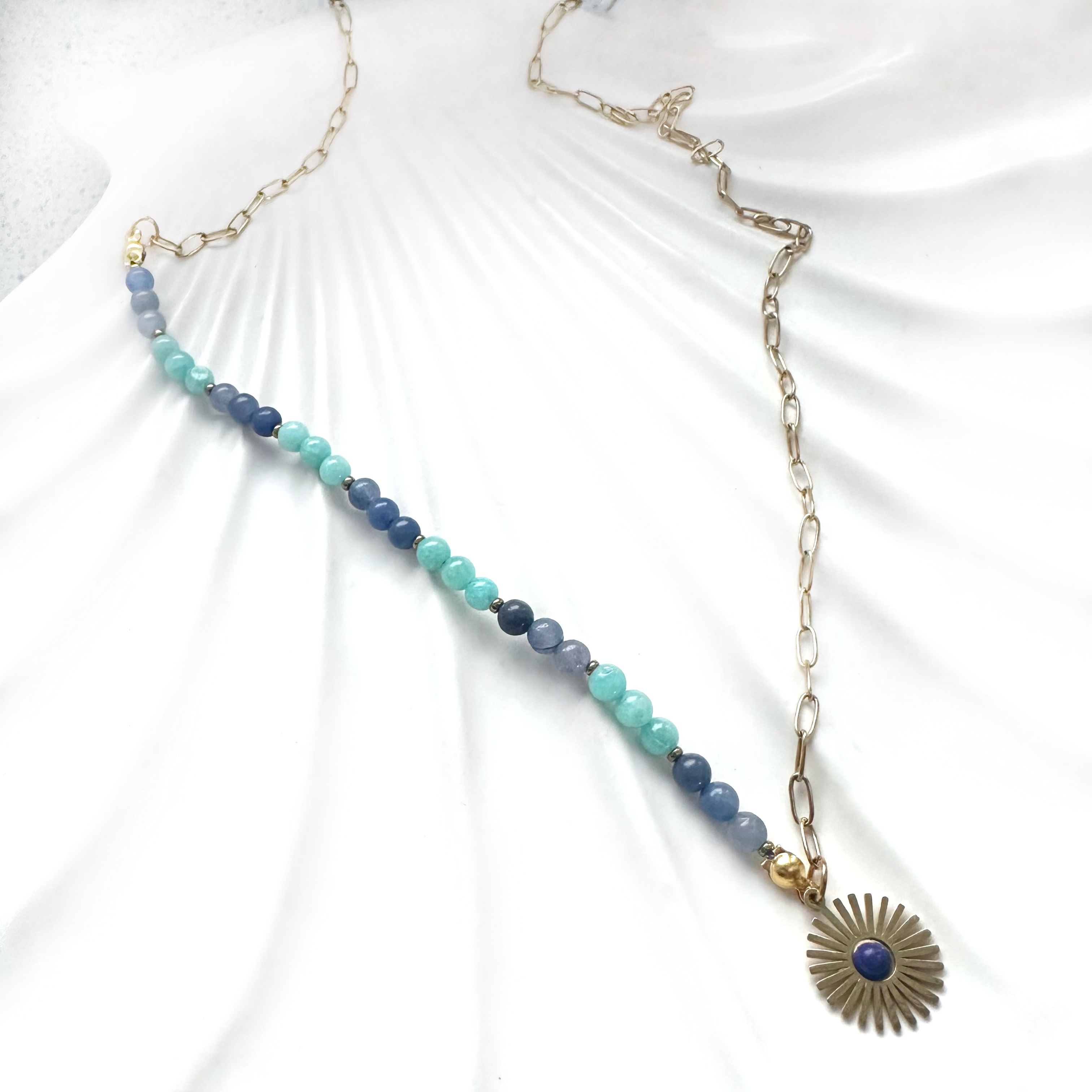 Ten naszyjnik został stworzony z myślą o miłosnych właściwościach relacji i komunikacji w związku. To biżuteria intencyjna, która wspiera otwartość serca, szczere rozmowy i budowanie relacji opartych na spokoju, zaufaniu oraz wzajemnym zrozumieniu.