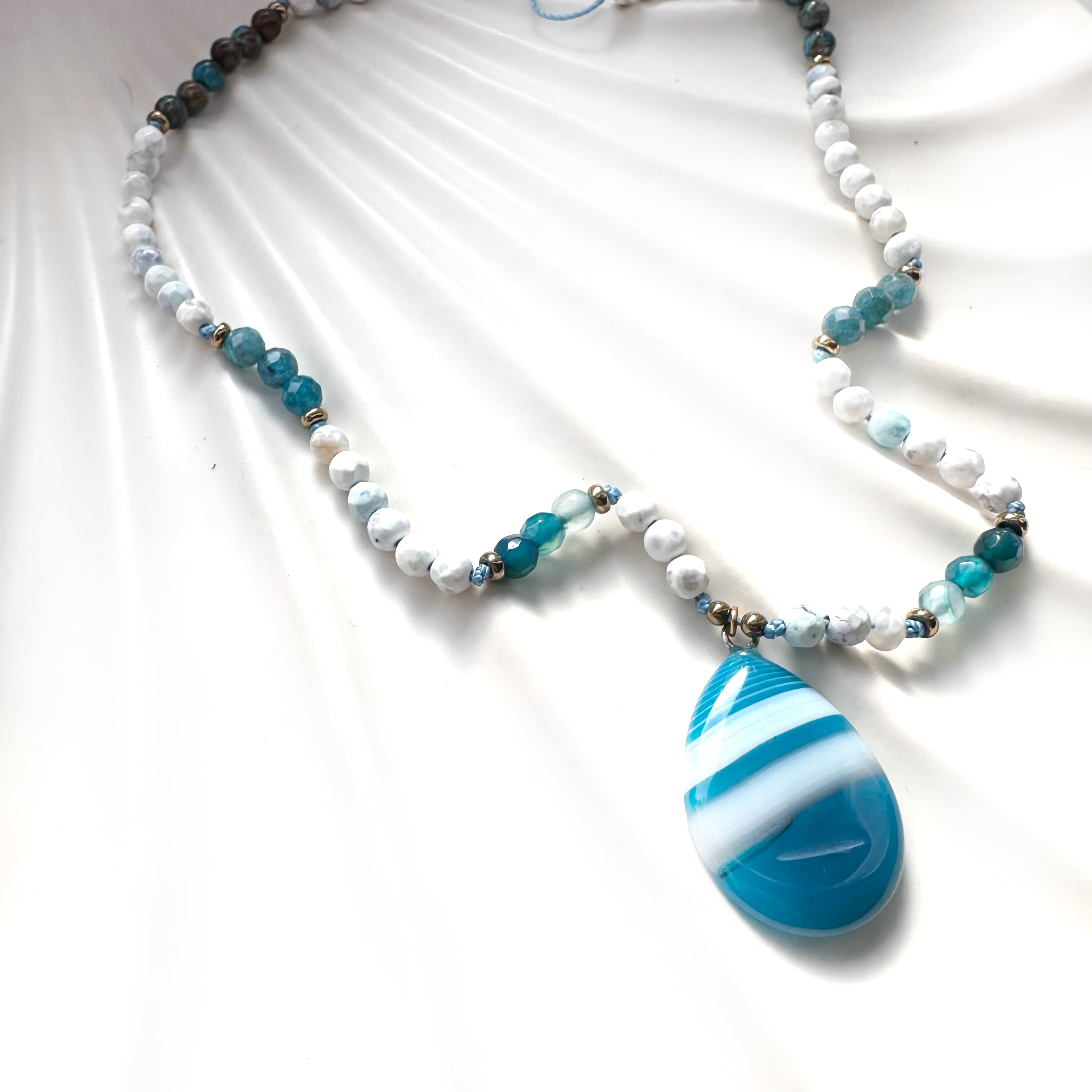 Agat Niebieski – kamień komunikacji i ukojenia. Łagodzi emocje, wspiera szczere rozmowy i pomaga w wyrażaniu siebie.