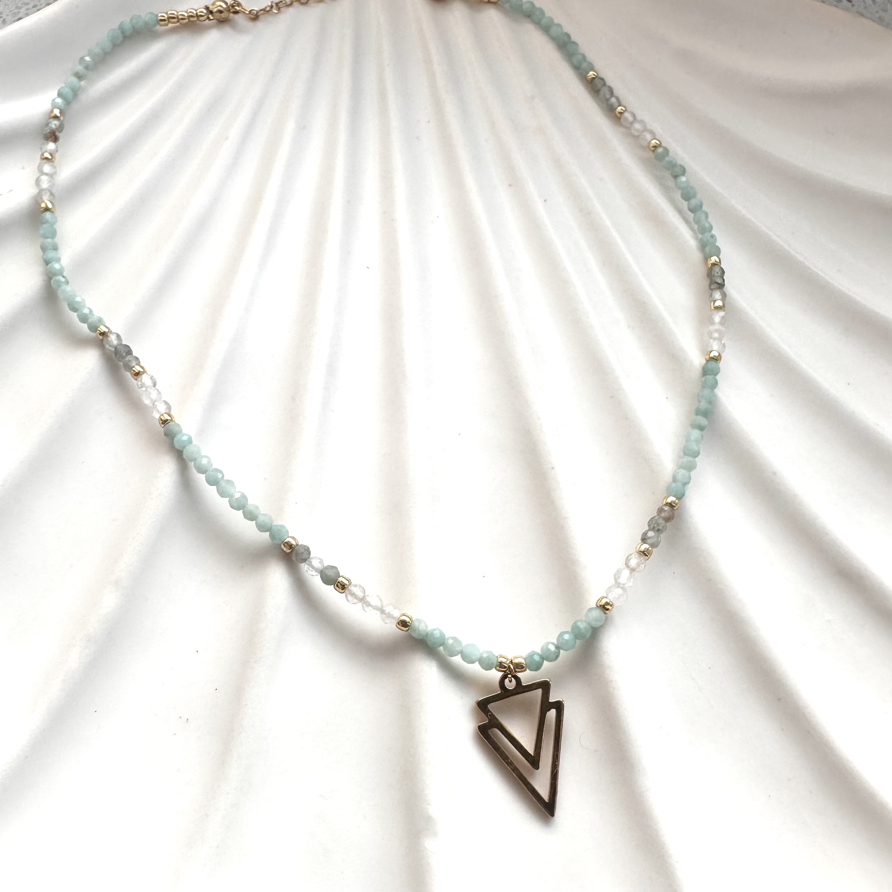 Naszyjnik z amazonitem, apatytami, kryształem górskim i zawieszką w formie trójkątów – „Równowaga Energii”