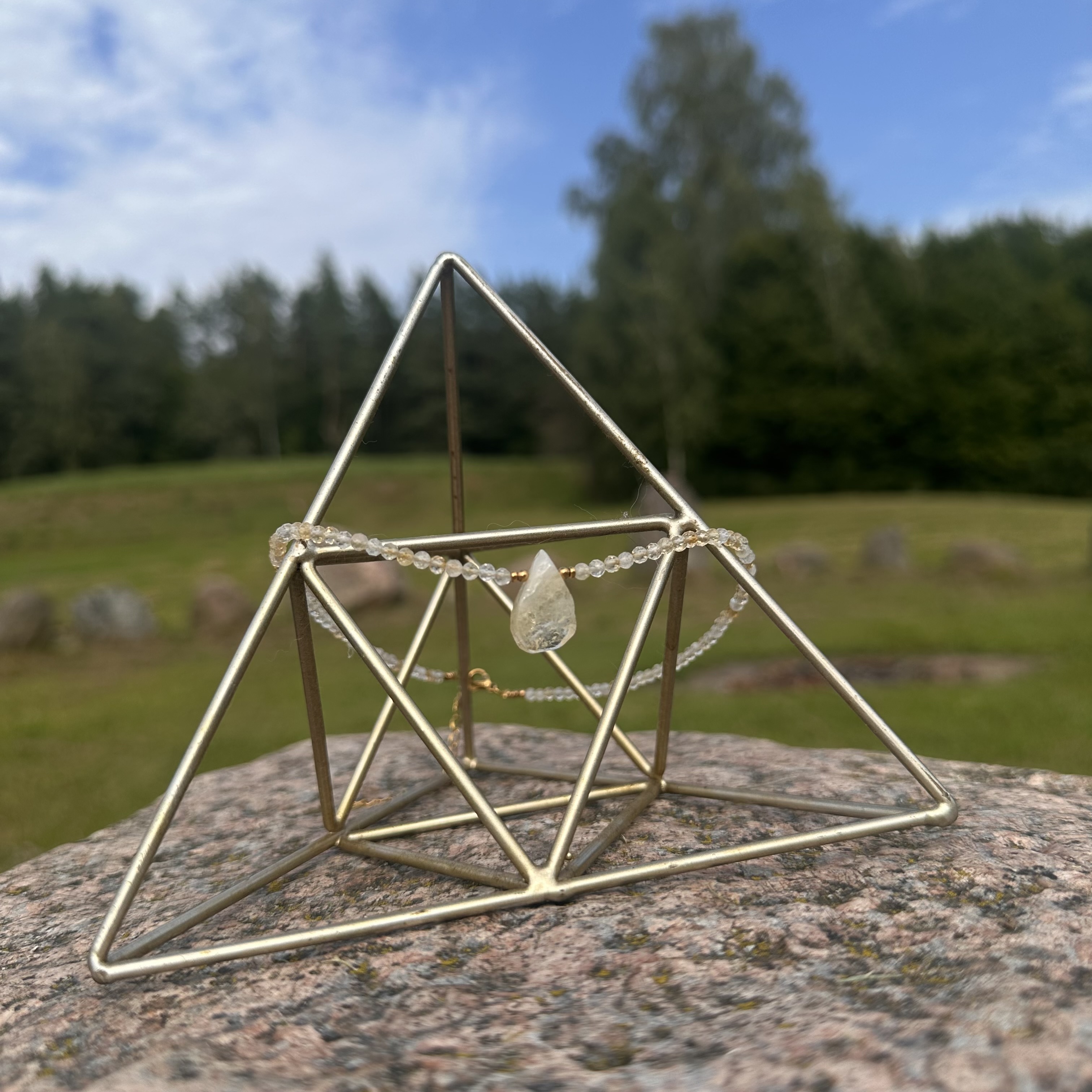 Ten naszyjnik to talizman światła, radości i obfitości. Wykonany z drobnych fasetowanych kamieni, które pięknie odbijają promienie słońca, przyciąga uwagę swoją subtelną elegancją. Centralnym punktem jest cytryn w kształcie kropli, emanujący energią słońca i optymizmu.