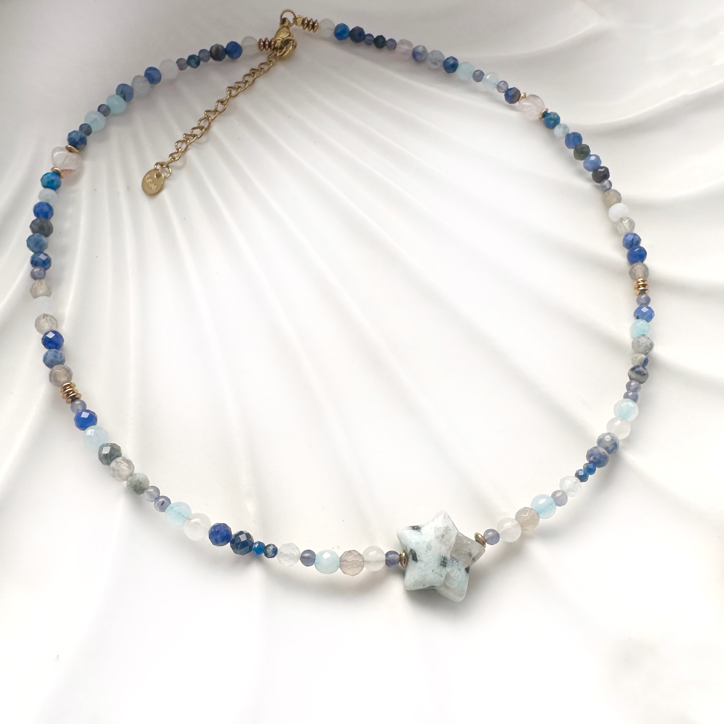 Ten naszyjnik został wykonany z naturalnych kamieni, których połączenie niesie ze sobą subtelną, harmonijną energię. Centralnym elementem jest gwiazda z jadeitu – symbol szczęścia, ochrony i wewnętrznej równowagi. Jadeit od wieków uznawany jest za kamień spokoju, dobrobytu i mądrości serca.
