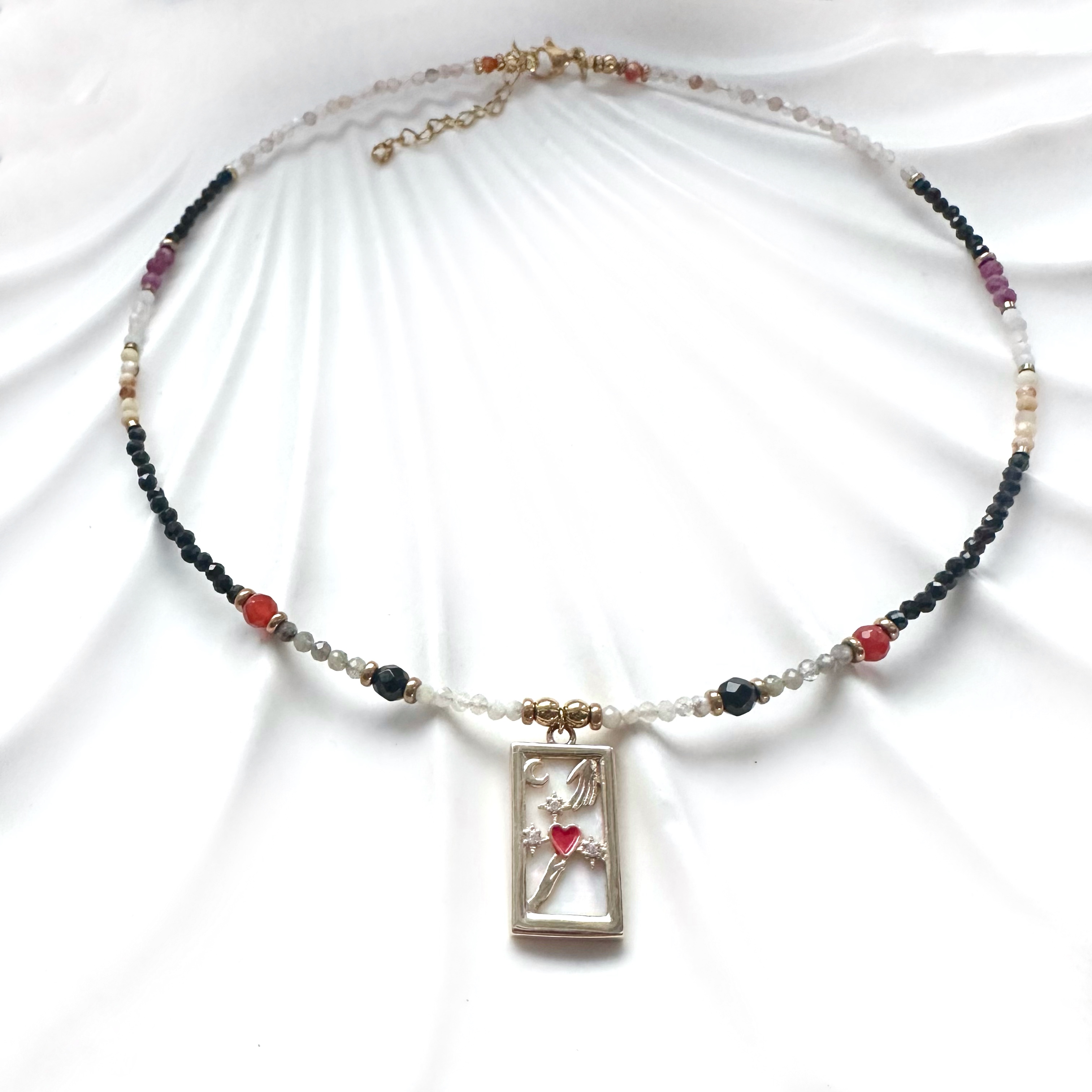 Ten wyjątkowy naszyjnik z Kartą Kochanków to biżuteria intencyjna stworzona z myślą o miłości świadomej, głębokiej i prawdziwej. Symbol karty przypomina, że każda relacja jest wyborem serca – opartym na szczerości, harmonii i połączeniu dusz. Subtelne czerwone serce w zawieszce podkreśla energię uczuć, pasji i odwagi w kochaniu.