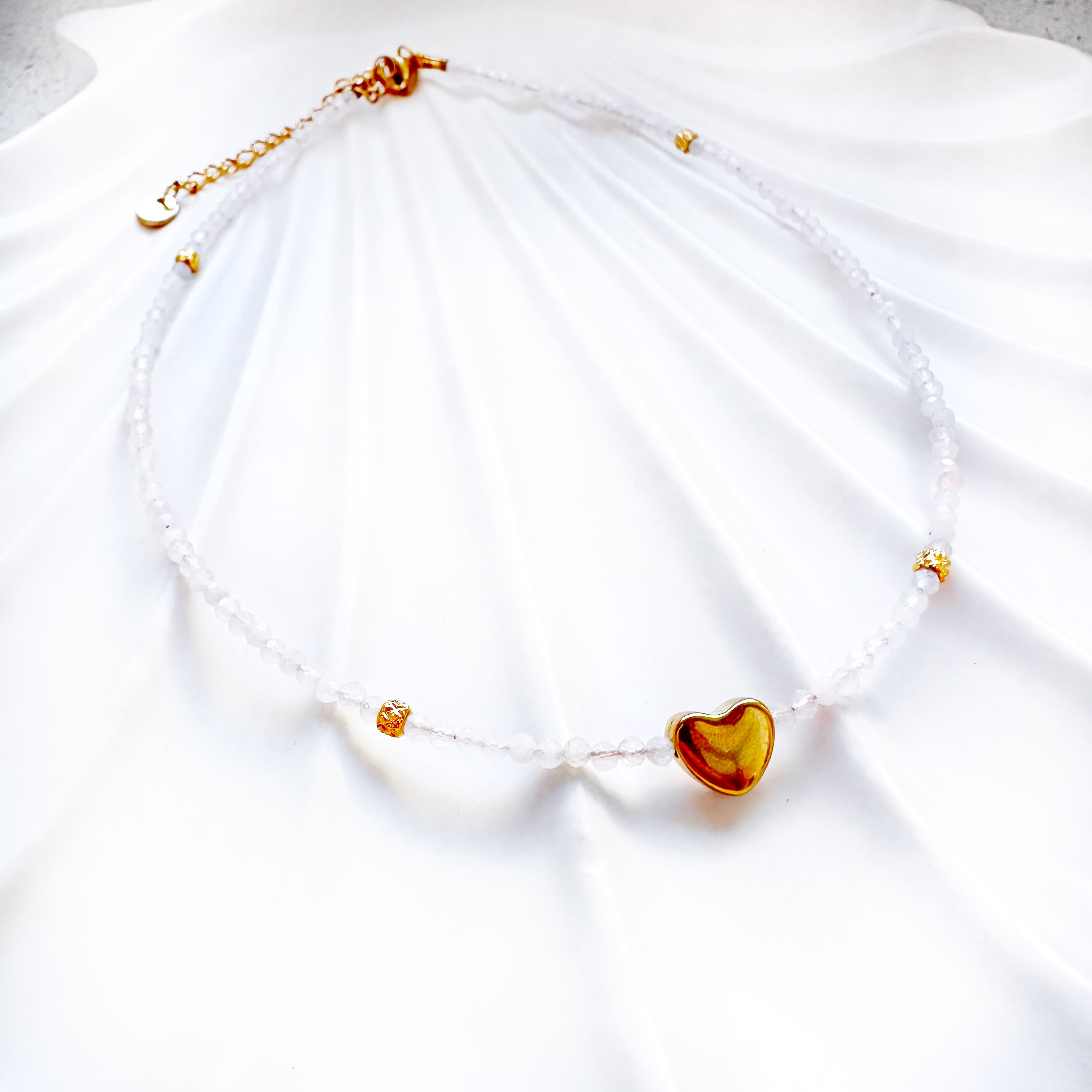 Delikatny naszyjnik symbolizujący miłość i harmonię. Centralnym elementem jest serce – znak uczuć, bliskości i więzi – w połączeniu z kwarcem różowym, kamieniem bezwarunkowej miłości i spokoju.